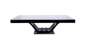 This exceptional two tone French Art Deco dining table features a wonderful mahogany top with side in black lacquer and black lacquer extension panels and base that sits atop a scrolled black lacquer pedestal giving it a floating design.