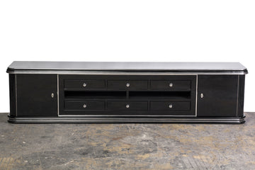 This exceptional Art Deco low board features two (2) swing doors, six (6) drawers and a long and narrow storage / display compartment with chrome lines & fixtures finished in a gorgeous high gloss black lacquer.