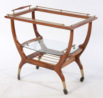Italian Mid-Century Modernist bar cart in wood with details in brass. The cart features a galleried top over a tray shelf.
