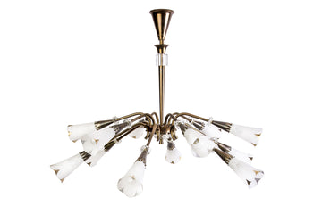 Beautifully designed and highly ornamental chandelier in polished brass designed and executed by Gene et Michon with twelve (12) frosted white and gilded decorations shades by Sevres.