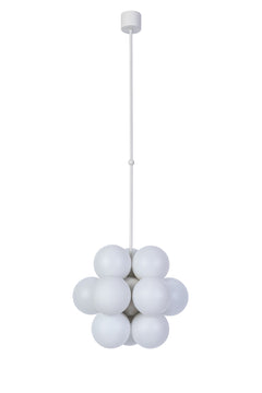 This gorgeous 1970's Mid-Century Modernist chandelier was designed by Kaiser Leuchten and it features an enameled brass frame and 12 hand-blown double layer opal glass globes.