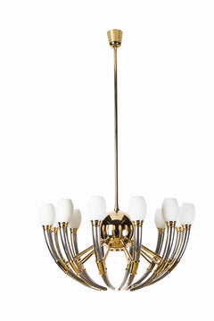 This gorgeous (13) light Silver, Gold & Opal Glass Regency Chandelier is in excellent, original condition, featuring double-layered hand-blown opal glass shades and a brilliant brass & chrome frame. The chandelier has been newly rewired.