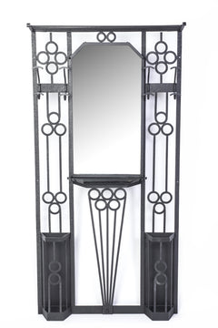 The luxe Art Deco wrought iron coat / umbrella rack features a very attractive and streamline design with 4 double coat hooks, two umbrella holders and a center mirror. This is the perfect piece for any foyer. The piece has been restorer to its original splendor.