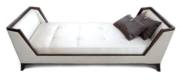 This luxe daybed is made out solid Mahogany and upholstered in cream color cotton/ silk combination fabric and cushion in wrought silk.