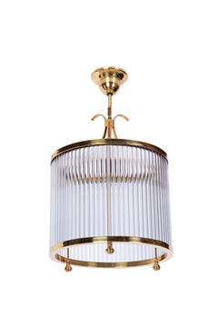 This Luxe cylindrical Art Deco chandelier in the style of Petitot features a polished brass frame with tubular glass inserts. Brass has been newly polished and piece rewired to American Standards.