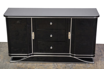 This beautiful Art Deco sideboard / credenza features two (2) curved doors, three (3) center drawers and chrome fittings & fixtures, finished in a high gloss black lacquer.