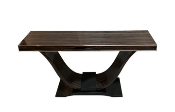 Console in a solid mahogany frame veneered in luxurious Macassar. Curved foot, chrome lines and high lacquer finish.