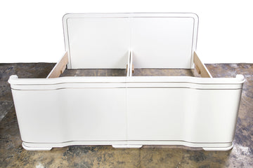 This magnificent French Art Deco bed frame features chrome line detailing with a luscious pearl high gloss lacquer finish. It would look excellent in any room or decor. The bed can de split into two twin beds.