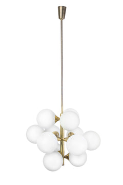 This wonderful Mid-Century Modernist sputnik chandelier features a brass base with (12) opal glass bulbs. It is in excellent condition and has been newly rewired.