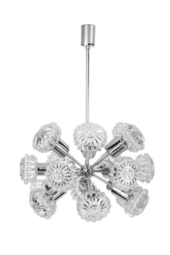 This exceptional Mid-Century Modernist sputnik was designed by Richard Essig. It features a chrome-plated frame with eighteen (18) stylized crystal globes.