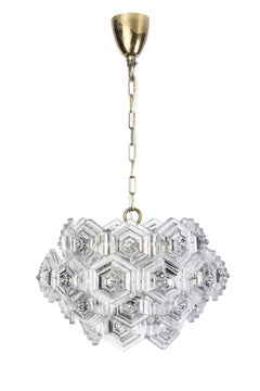 This beautiful Mid-Century Modernist chandelier features a four tiers honey comb design in stylized hexagonal form of clear crystals attached to a brass chain. It is in excellent condition and has been newly rewired.