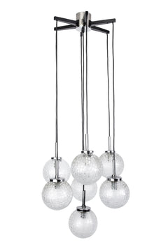 This stunning Mid-Century Modernist pendant / chandelier by Doria features (7) etched glass ball shades descending from a star form black lacquered base with chrome detailing.