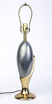 Very stylized mid-century modernist table lamp depicting a Calla in brass with a metallic gray ceramic insert.