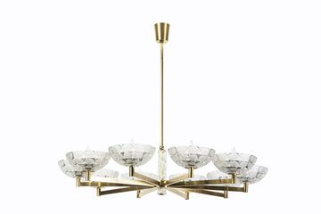 This gorgeous Austrian chandelier was executed by Kalmar and features a brass frame with frosted tubular glass detailing and (10) relief glass shades with frosted cut-outs.