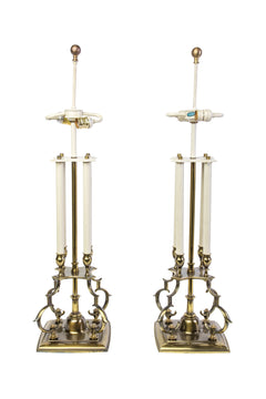 This beautiful pair of Mid-Century Modernist Candlestick Table Lamps are by Stiffel in the manner of Tommi Parzinger. They feature an antique brass finish and detailing with (4) tubes emulating the look of candlesticks.