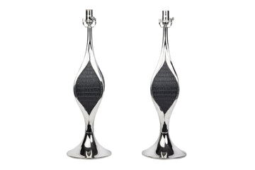 This pair of Mid-Century Modernist table lamps features a sculptural design in chrome with embossed crocodile black leather detailing by Laurel Lamps.