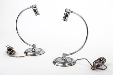This handsome pair of Art Deco table top lamps by Chase Metalworks Co., of Waterbury, CT, . It features a chrome frame with an arc form design. T