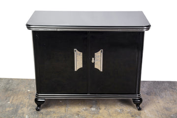 This sophisticated Art Deco commode features two (2) swing doors, chromed lines & fixtures, finished in a high gloss black lacquer and extension plate . Interior in Mahogany.