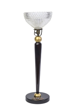 This beautiful French Art Deco table lamp (circa, 1925) is from the pre-war period, with a bronze signature badge and inventory number under the base showcasing it's authenticity. It features a gorgeous original crystal shade and a high gloss lacquered wooden base with gold leaf detailing. It has been newly rewired and is in excellent condition.
