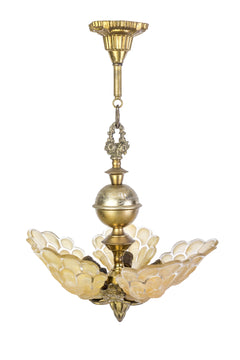 This exquisite Art Deco chandelier by Martele features a wrought iron base in plated brass and beautiful peacock form glass shades in hues of gold.