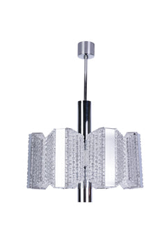 This sensational Grand Skyscraper Mid-Century Modernist chandelier was designed by Kaiser Leuchten. It features an octagonal shape, textured relief glass design and chrome banding detail. It has been completely rewired and is in excellent condition.