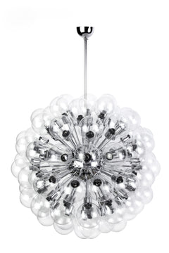 This spectacular Mid-Century Modernist Bubble Sputnik was designed by Motoko Ishii. It features a chrome frame with (84) transparent blown glass globes surrounding the frame creating a bubble form design. It has been newly rewired and is in excellent condition.