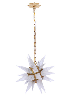 This magnificent star form chandelier is composed of polished rock crystal quartz pyramids that burst out of an antique brass finished metal frame.