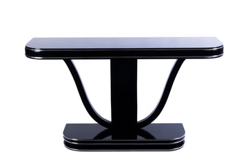 This superb French Art Deco Style console features a high gloss black lacquer finish with curved detailing and chrome line details.