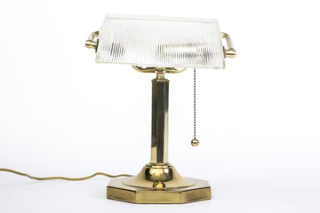 This excellent Art Deco table lamp features a ribbed trapezoid glass shade with brass detailing. It is in excellent condition and has been newly rewired.