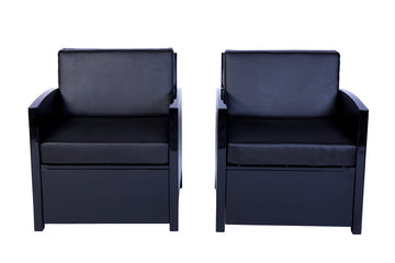This exceptional pair of Art Deco armchairs feature a beautiful high gloss black lacquer finish with a plush slate leather upholstery.