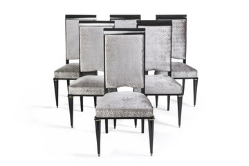 Stunning set of six (6) French Art Deco dining chairs designed by Jules Leleu in solid mahogany.