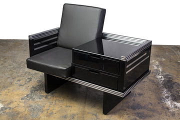 This exceptional Art Deco armchair is a unique piece and it features a built-in side table, luscious pearl leather upholstery, chrome detailing, and a black lacquer finish.