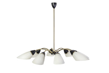 This beautiful Mid-Century Modernist chandelier features a spider form design brass frame and black details with (8) conical glass shades.