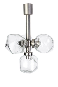 This beautiful Mid-Century Modernist 1960's pendant chandelier was designed by Motoko Ishii. It features a chrome base with (4) octagonal glass shades. It is in excellent condition and has been newly rewired.