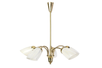 This chic Mid-Century Modernist chandelier features a spider form design brass frame and black details with (5) conical glass shades and adjustable multi-directional arms.