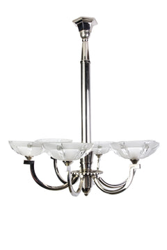 This chic Art Deco chandelier by Petitot and shades by Ezan features a nickeled brass frame with six (6) beautiful frosted glass shades.