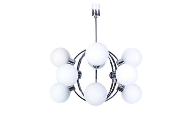 This superb 1970's Mid-Century Modernist sputnik chandelier features an atomic form design on a chrome frame with (12) opal glass globes.