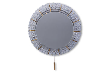 Rare Mid-Century Modernist backlit mirror / sconce designed by Emil Stejnar for Rupert Nikoll. It features a circular donut of strings of lucite pearls with a mirror center.