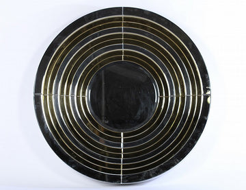This stunning Mid-Century Modernist mirror features a grandiose round segmented design with alternating bands of clear and yellow mirror detailing.