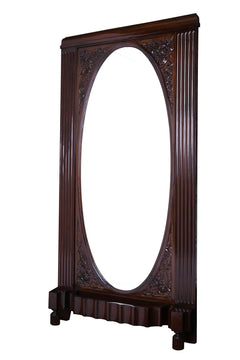 Impressive rectangular solid mahogany Art Deco freestanding mirror with carved floral decoration and oval mirror insert.