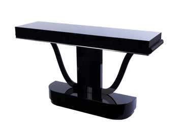 This superb French Art Deco style console features a high gloss black lacquer finish with curved detailing and a chrome line detail.