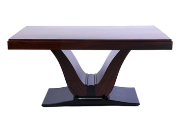 This magnificent French Art Deco dining table features a rosewood top with a scrolled base design finished in a high gloss black lacquer.