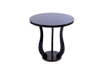 This sensational French Art Deco style side table features a book matched design on Macassar wood with three curved legs in a tulip design finished in black lacquer.