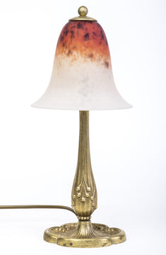This wonderful 1920's French Art Deco bronze table lamp Signed by Charles Schneider is an original in excellent condition, beautifully designed and adorned with a signature Art Deco shade made with wonderful inclusions in a marvelous color scape that transitions from intense red/amber at the top to a delicate milky white.